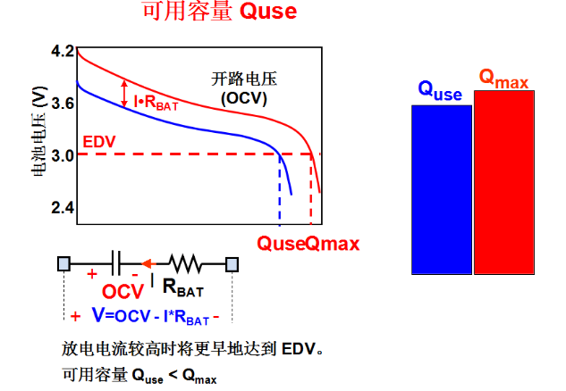 鋰電池的容量中還有一個對應的容量就是可用容量,可用容量實際上也許只用了80-90%!因為剛才講的是電池的化學容量,鋰電池的化學容量是在電流很小的時候測得的容量,它更多的是由電池本身的特性決定的。那實際在電池的使用過程中,這么多容量不是都能夠放得出來的,在實際的使用過程中,由于有一定的放電電流,所以放電曲線會比開路電壓曲線低,大家可以看到這條曲線,由于存在電池的內阻,實際的放電曲線是藍色的這條曲線,由藍色的曲線和紅色的曲線對應的值得到Quse,Quse實際指的是電池的可用容量,在這張曲線中我們發現,由于電池內阻的存在使這個曲線的位置往下移了,那么放電的時候會更早的達到放電終止電壓,也就是更早的達到EDV,所以Quse一般是小于Qmax。